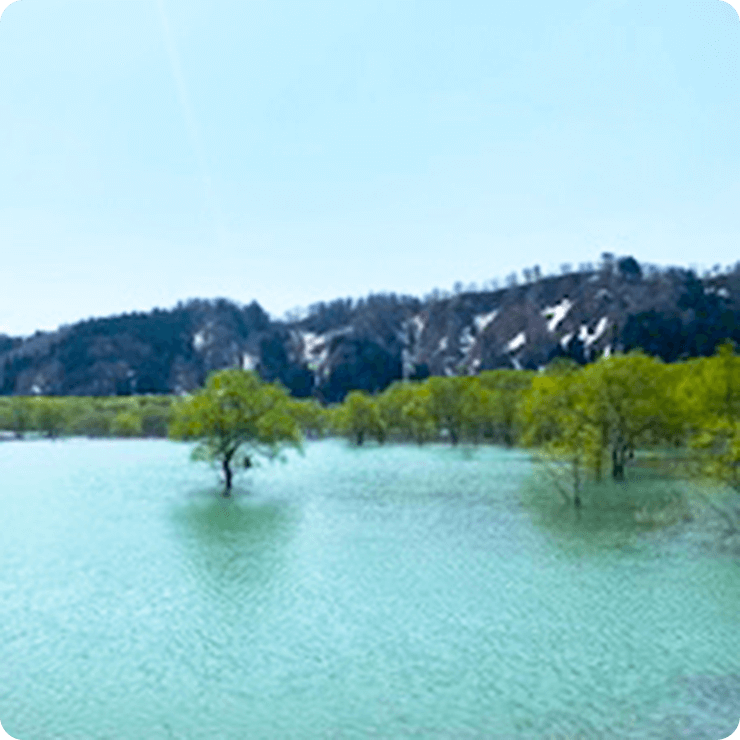 雪解け水で湖の水位が上がる春先限定の神秘的な風景です。カヌーやカヤックも楽しめます。